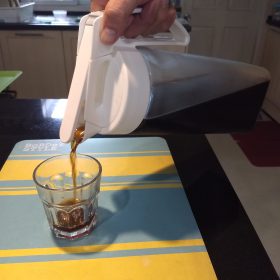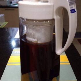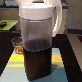 - นำเหยือกน้ำเก็บในตู้เย็น โดยการวางนอน เพื่อให้น้ำท่วมผงกาแฟที่เตรียมไว้ เป็นเวลาประมาณ 12 – 15 ชั่วโมง ขึ้นอยู่กับความเข้มข้นของรสกาแฟที่ต้องการ