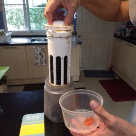 - ใส่ที่กรองที่บรรจจุผงกาแฟแล้วลงไปในเหยือก
